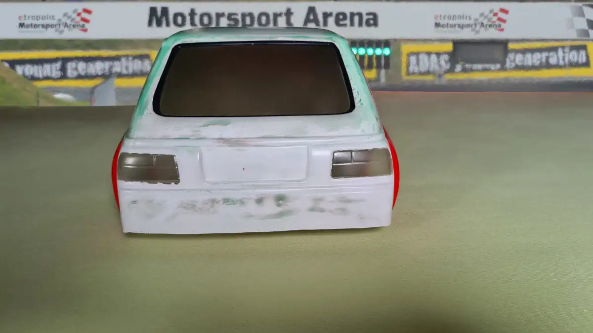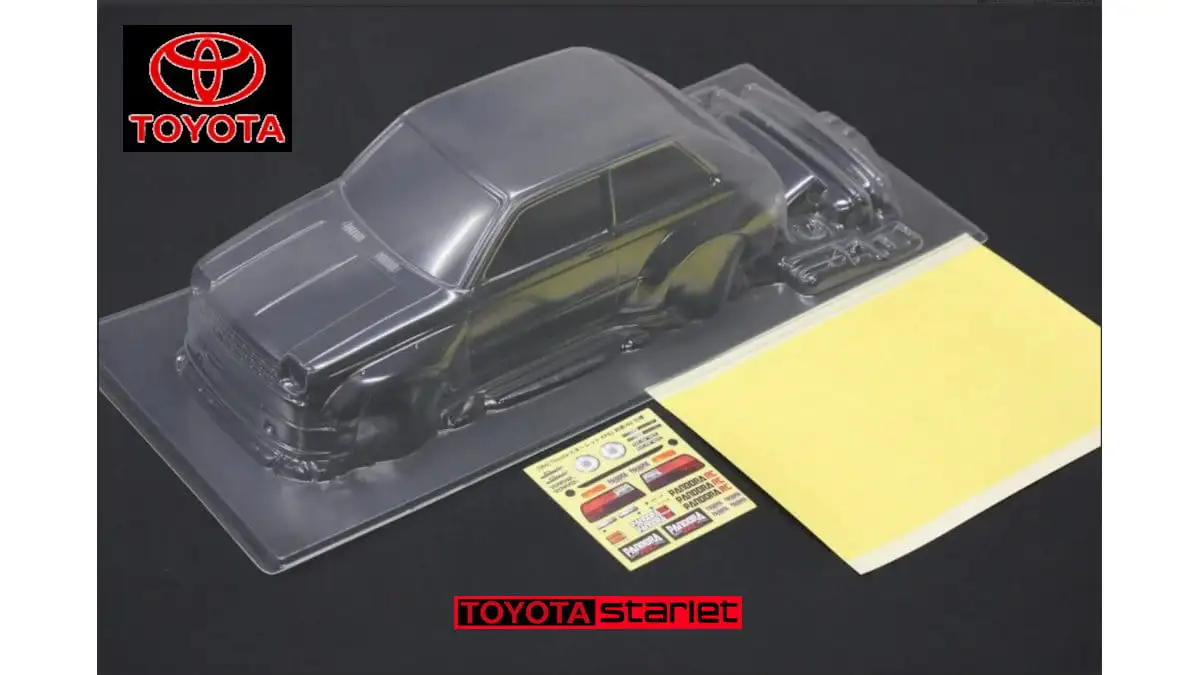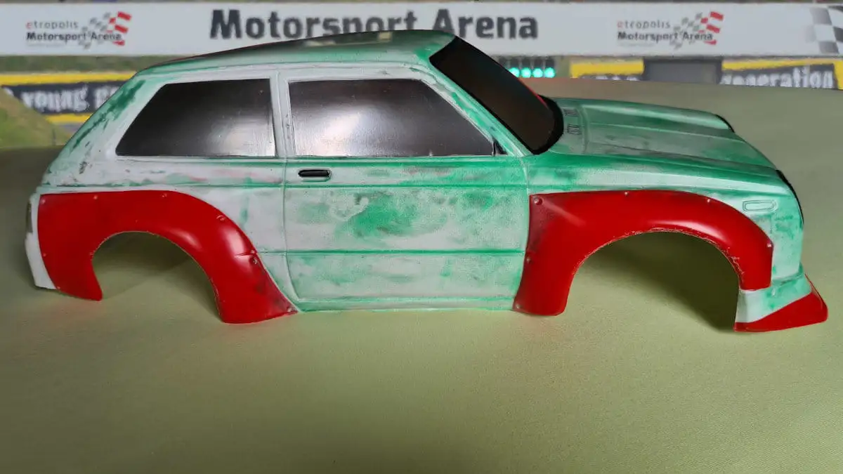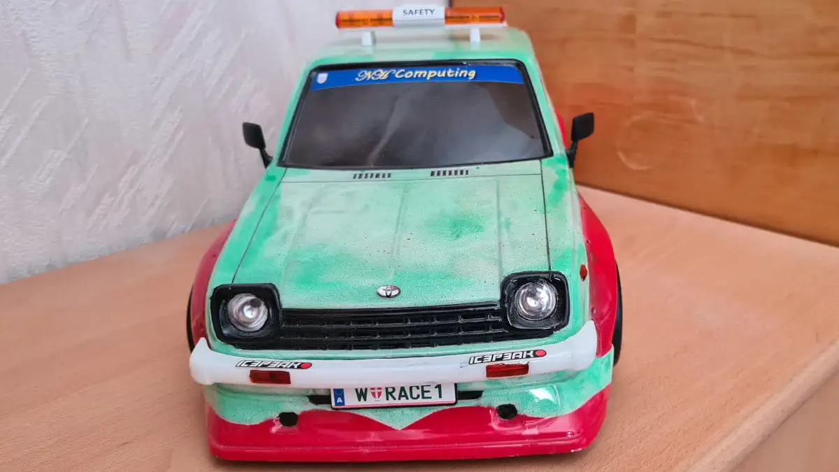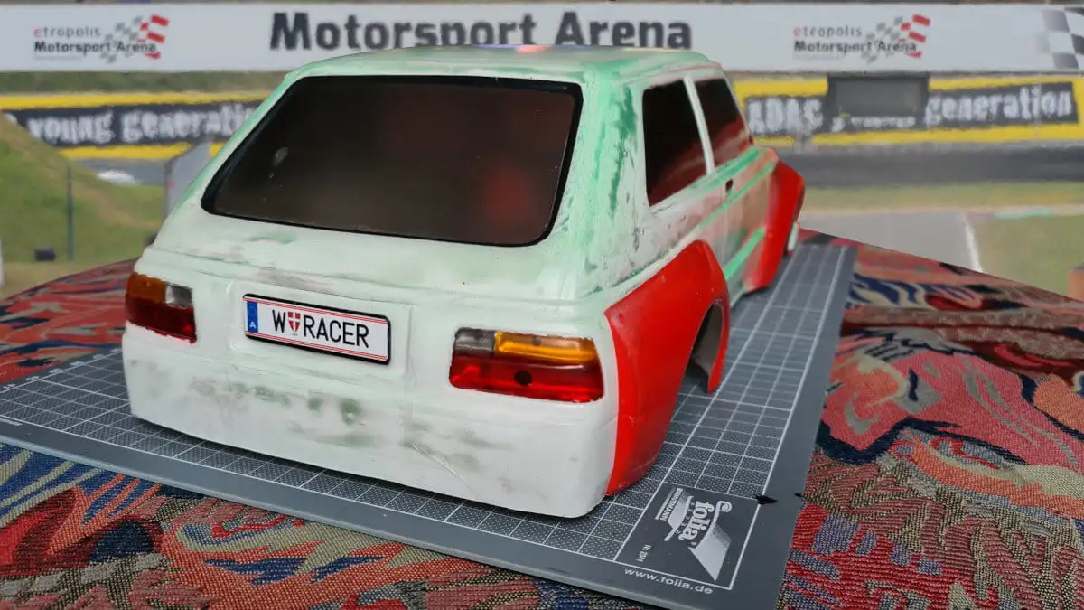 Die Karosserie ist gepresst aus durchsichtigen Lexan (Polycarbonat) mit einer Schutzfolie aussen. Stossstangen, Spoiler, Reflektoren und Aufkleber sind dabei.
