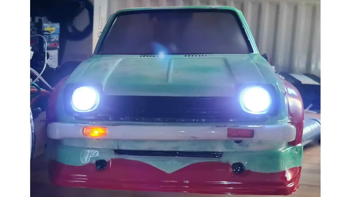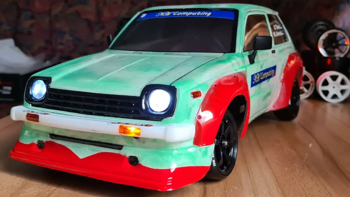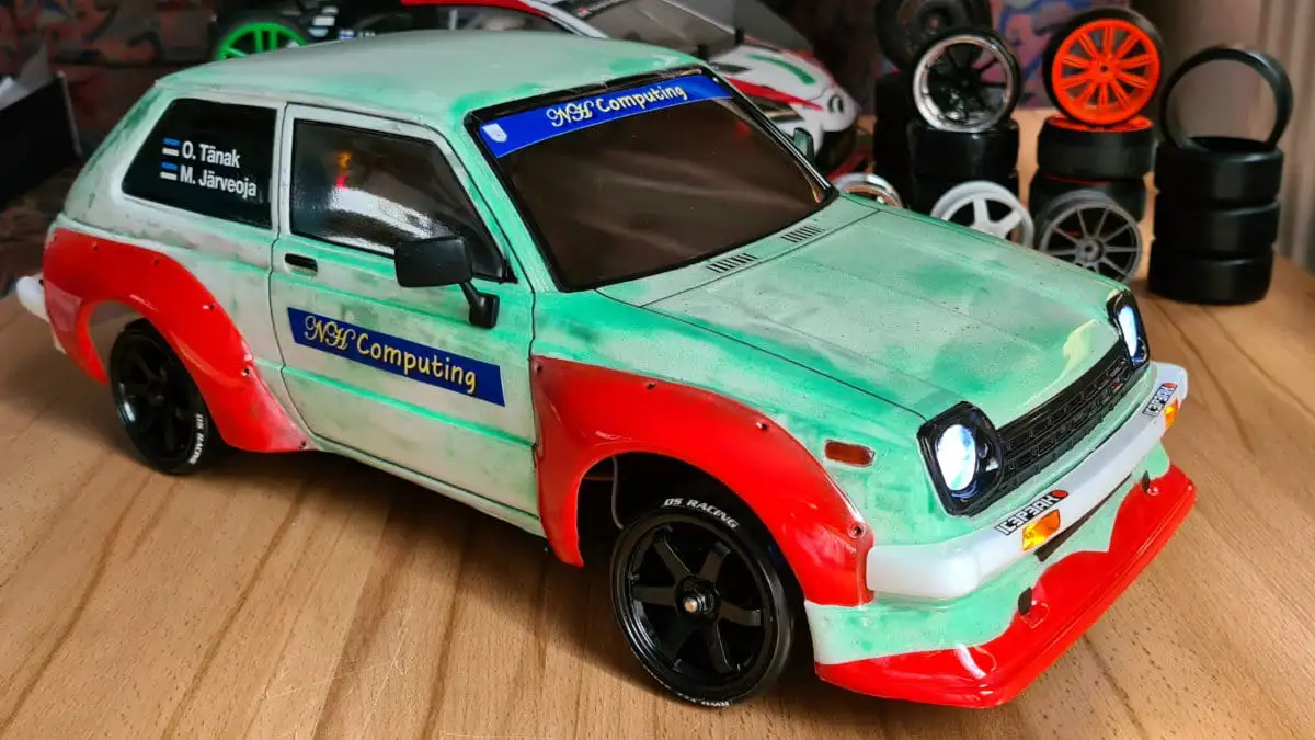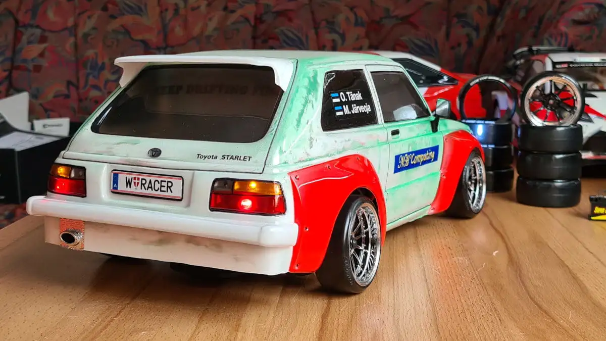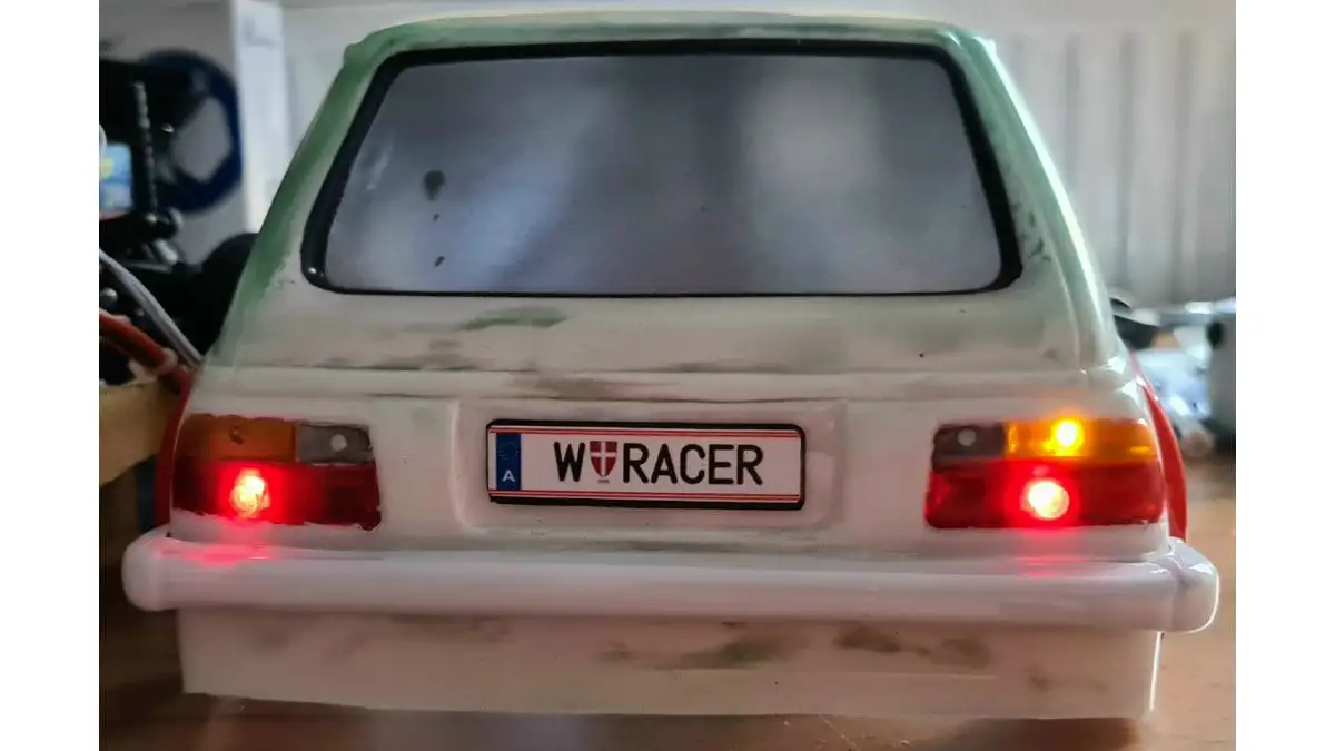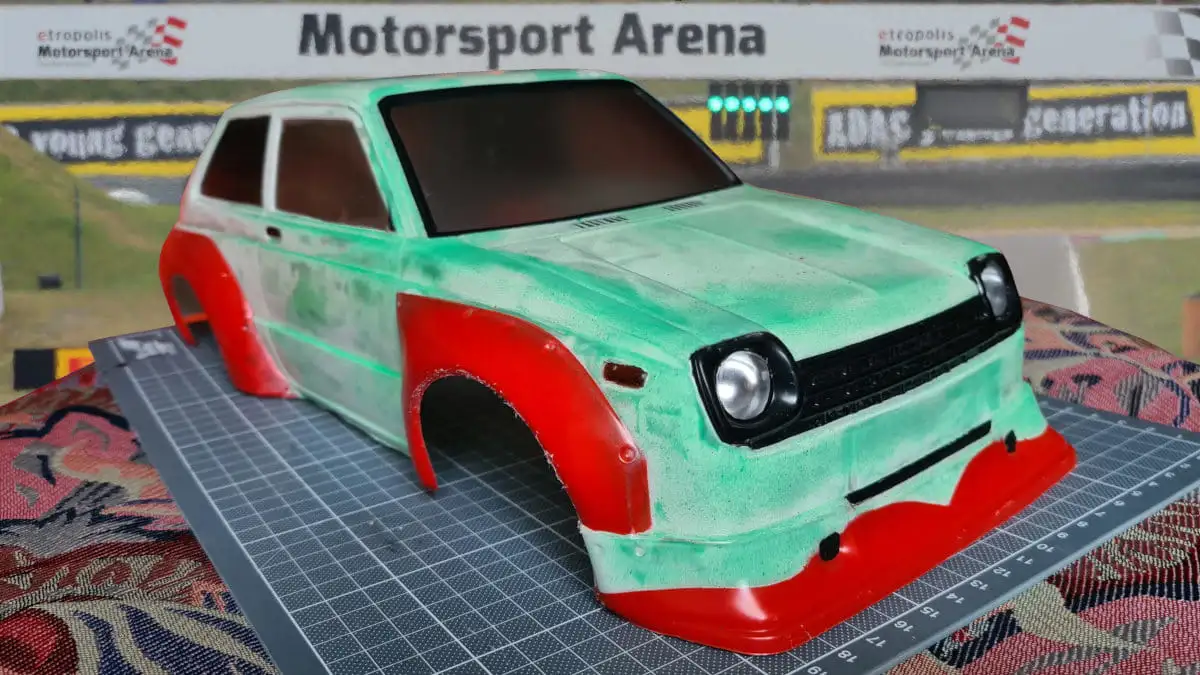 Die Karosserie ist gepresst aus durchsichtigen Lexan (Polycarbonat) mit einer Schutzfolie aussen. Stossstangen, Spoiler, Reflektoren und Aufkleber sind dabei.