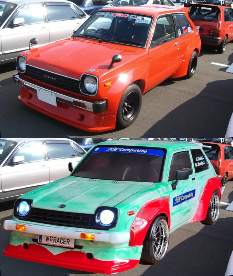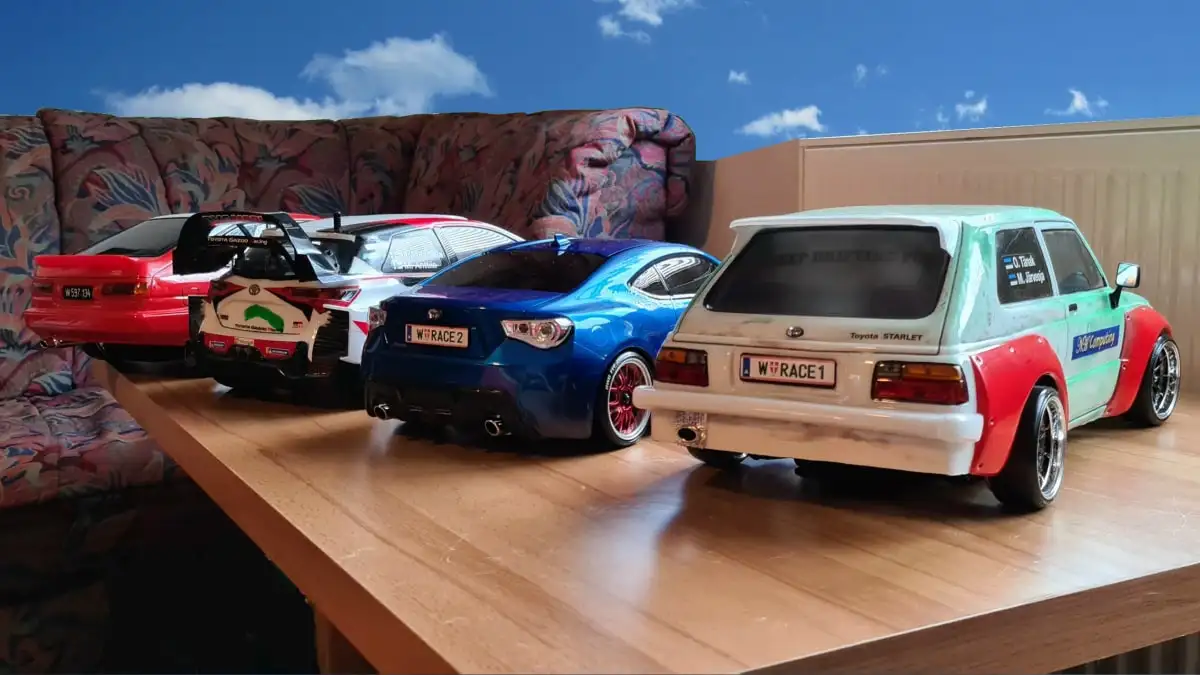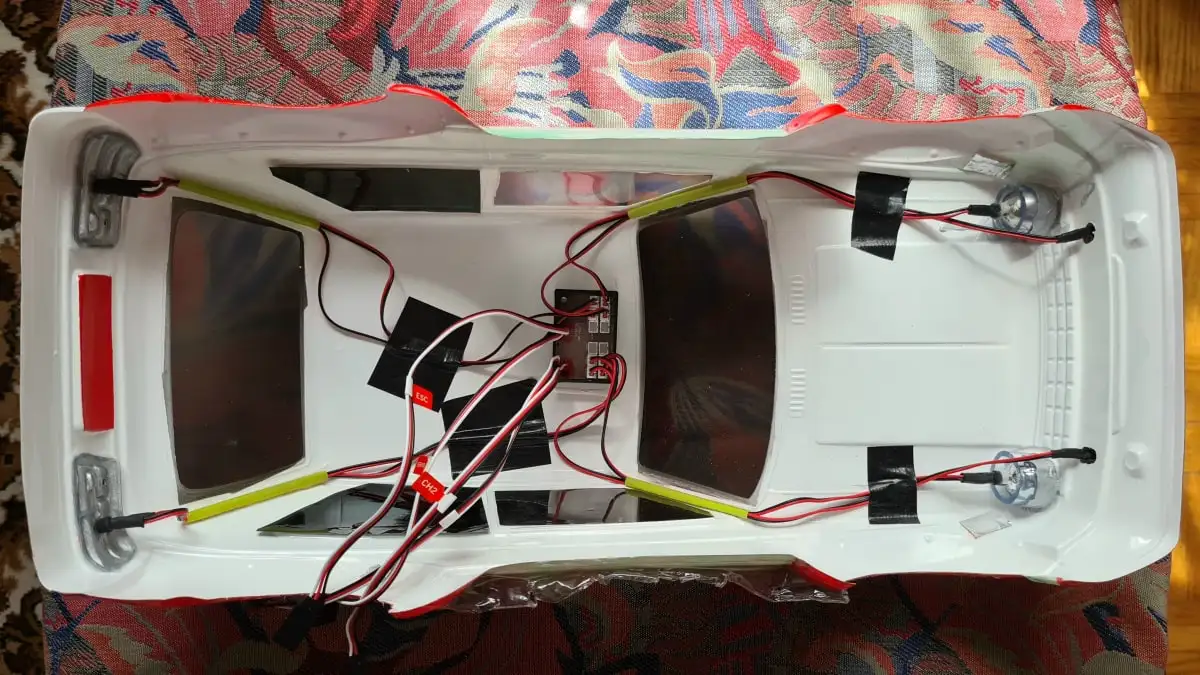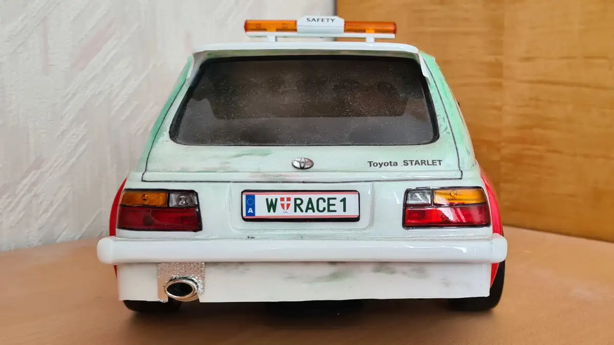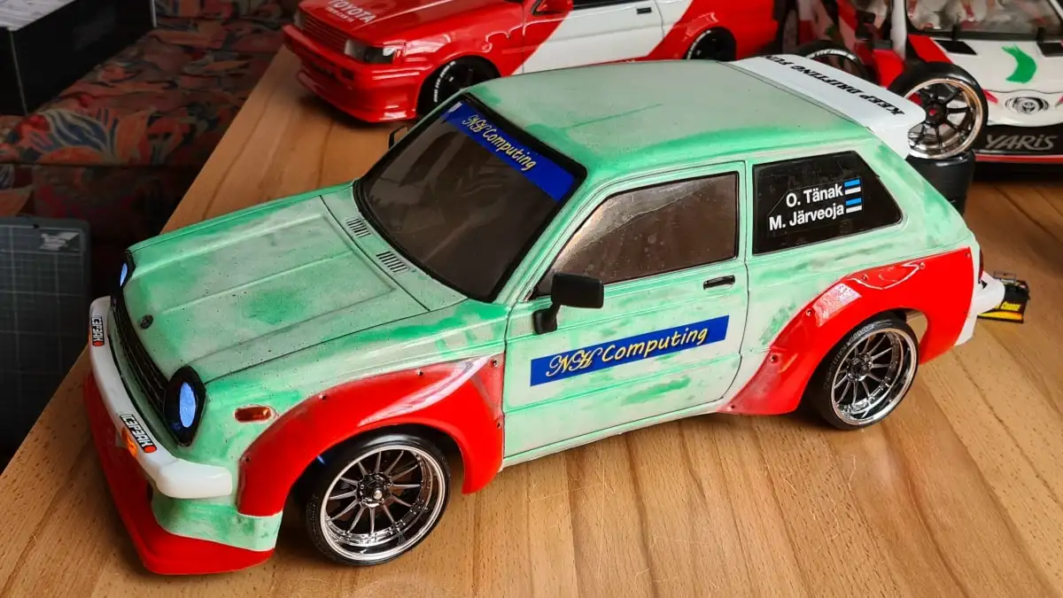Die Karosserie ist gepresst aus durchsichtigen Lexan (Polycarbonat) mit einer Schutzfolie aussen. Stossstangen, Spoiler, Reflektoren und Aufkleber sind dabei.