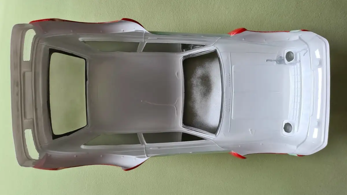 Eigentlich wollte ich grüne Punkte haben. Wie immer schwarz zuerst (Fensterdichtungen usw.), dann rot (Kotflügelverbreiterungen), dann ein bisschen grün (eigentlich Pünktchen) und am Schluss die Grundfarbe weiss.